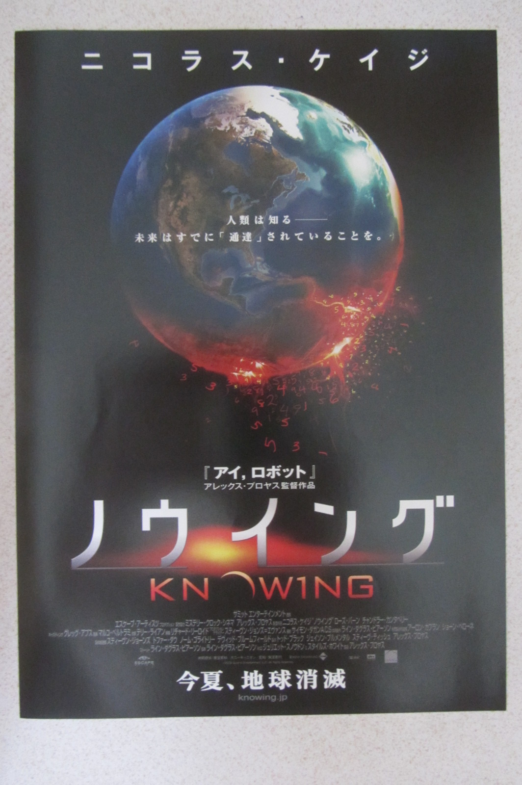 全新《地球毀滅密碼》(Knowing)日本海報單張,尺寸為B5(250 X 176 mm),Nicholas Cage主演。